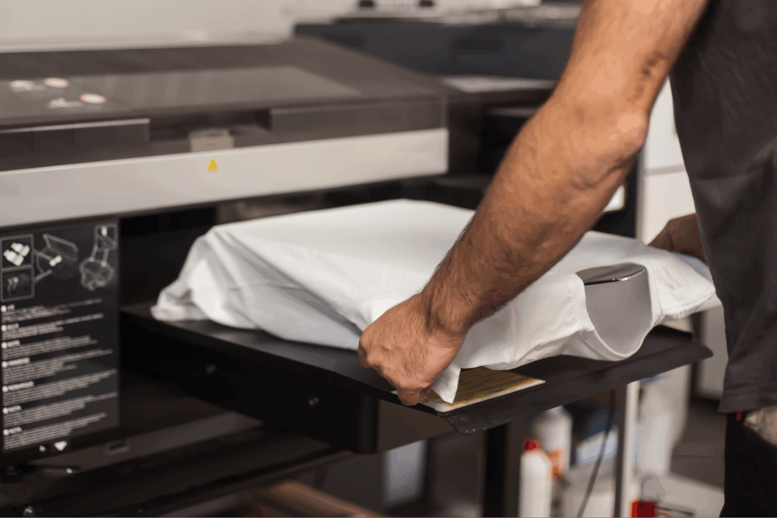 Once pre-treatment is complete and dried, the garment is loaded into the DTG printer, where the actual digital printing begins.